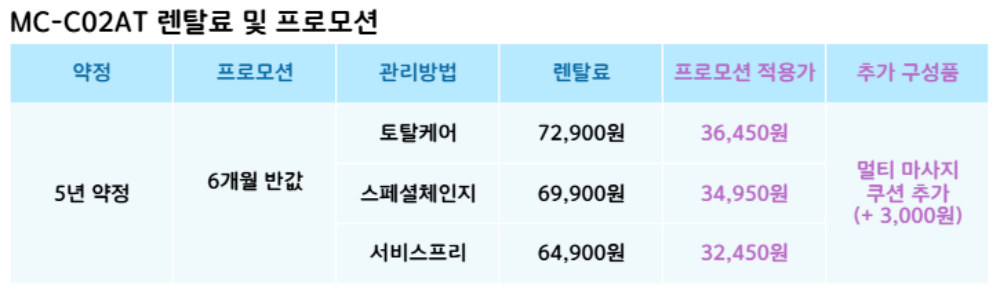 MC-C02AT 코웨이 [코웨이] 비렉스 안마의자 페블체어2 제품분류 안마의자 AS기간 렌탈기간내 최저 렌탈가 월 64,900 (렌탈가) 제휴카드 할인가 월 (렌탈가) 5년 서비스프리 스페셜체인지 토탈케어 제품색상 선택 헤이지블루 + 0원 린넨화이트 + 0원 에토프베이지 + 0원 테라고타핑크 + 0원 버터옐로우 + 0원 페더화이트 + 0원 추가구성품 선택 선택안함 + 0원 멀티 마사지 쿠션 (+3000원) + 3,000원 할인 제휴카드 보기 렌탈신청 장바구니