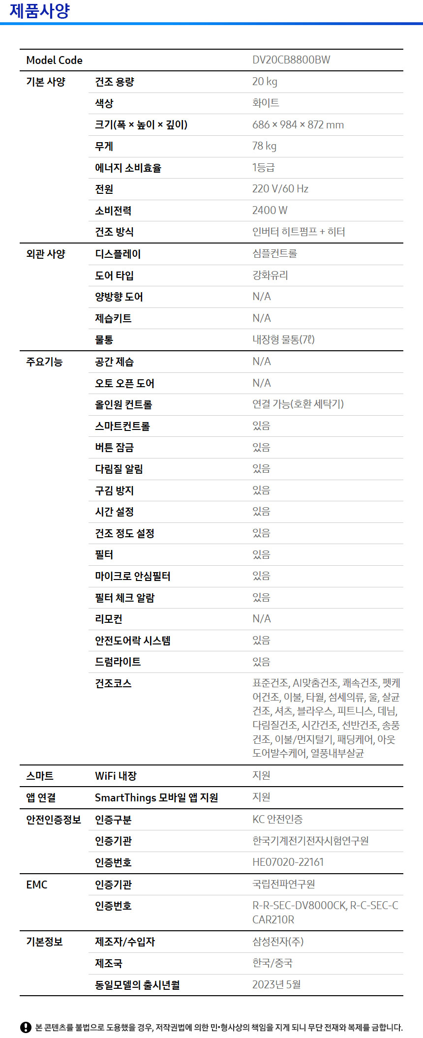 DV20CB8800BW BS렌탈 [삼성] 비스포크 그랑데 AI 건조기 20kg 화이트 제품분류 건조기 용량(총량) 20KG AS기간 1년 최저 렌탈가 월 34,300 (렌탈가) 제휴카드 할인가 월 (렌탈가) 3년 4년 5년 할인 제휴카드 보기 렌탈신청 장바구니
